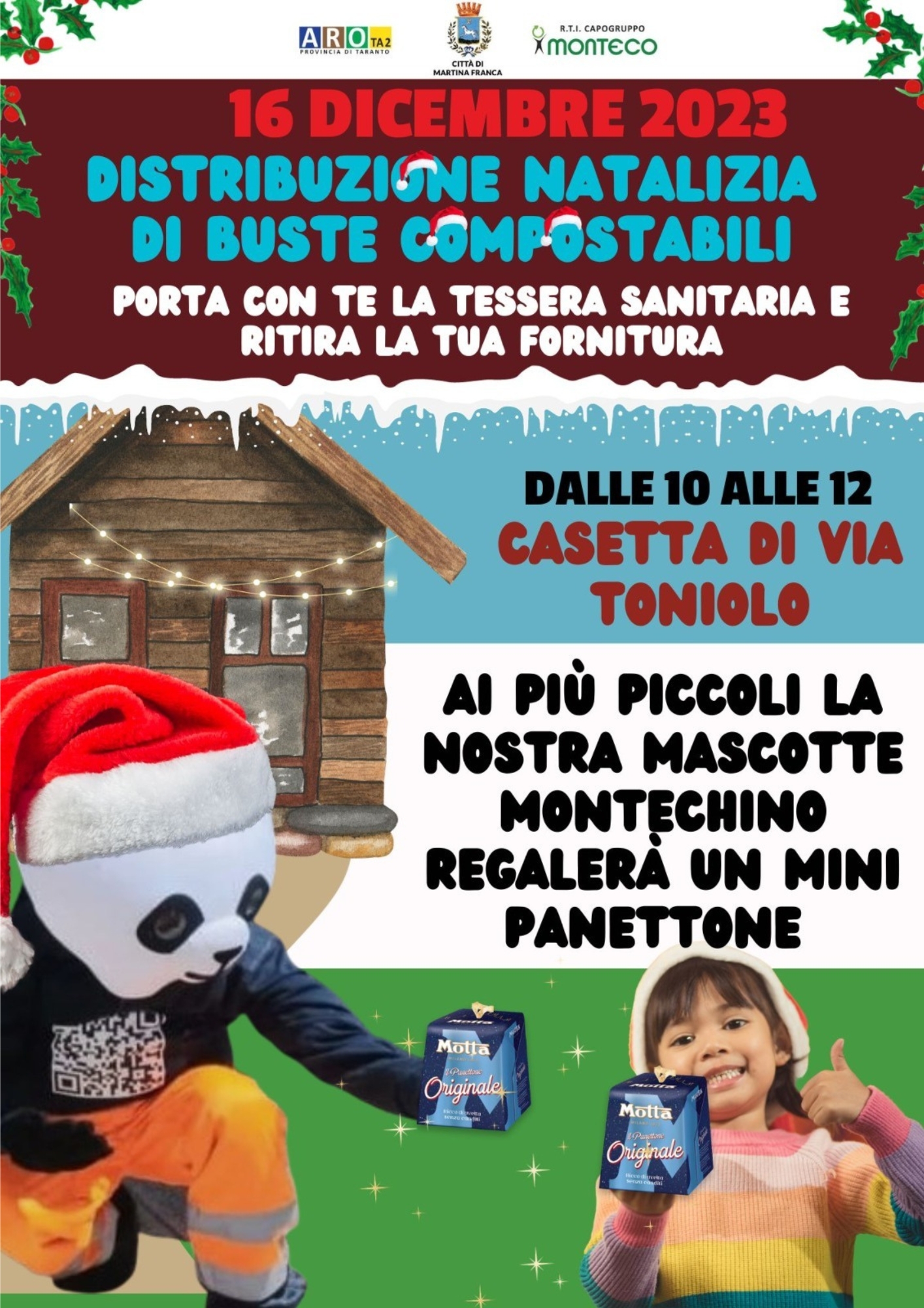 SABATO 16 DICEMBRE 2023 dalle ore 10:00 alle ore 12:00 presso la Casetta di via Toniolo verrà effettuata la distribuzione Natalizia di buste compostabili e gli utenti accompagnati da bambini e bambine riceveranno in omaggio un mini panettone.