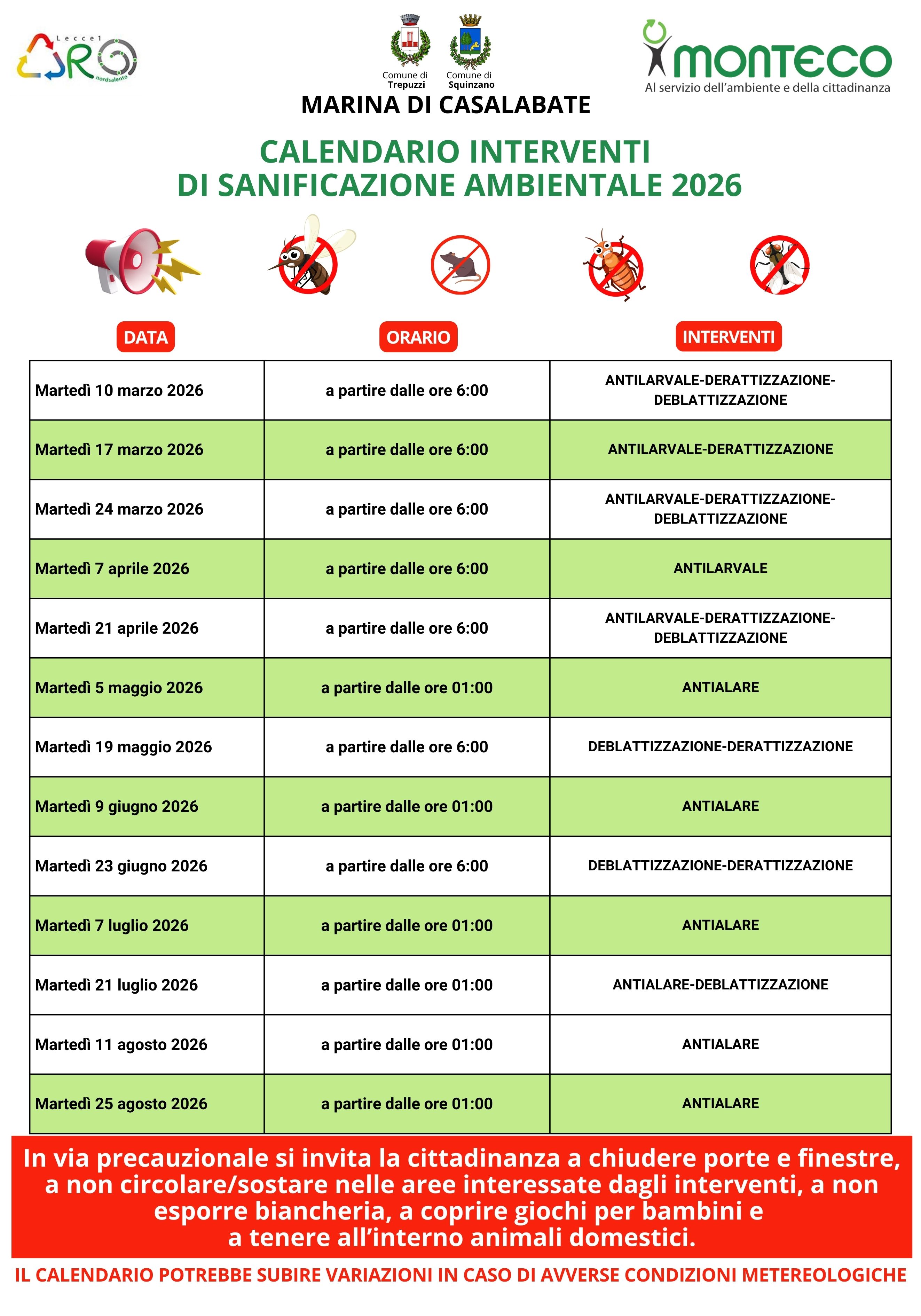 Per le date indicate nel calendario di INTERVENTI DI SANIFICAZIONE AMBIENTALE 2026, si invita tutta la cittadinanza del Comune di Trepuzzi 𝗮 𝗰𝗵𝗶𝘂𝗱𝗲𝗿𝗲 𝗽𝗼𝗿𝘁𝗲 𝗲 𝗳𝗶𝗻𝗲𝘀𝘁𝗿𝗲, 𝗮 𝗻𝗼𝗻 𝗰𝗶𝗿𝗰𝗼𝗹𝗮𝗿𝗲/𝘀𝗼𝘀𝘁𝗮𝗿𝗲 𝗻𝗲𝗹𝗹𝗲 𝗮𝗿𝗲𝗲 𝗶𝗻𝘁𝗲𝗿𝗲𝘀𝘀𝗮𝘁𝗲 𝗱𝗮𝗴𝗹𝗶 𝗶𝗻𝘁𝗲𝗿𝘃𝗲𝗻𝘁𝗶, 𝗮 𝗻𝗼𝗻 𝗲𝘀𝗽𝗼𝗿𝗿𝗲 𝗯𝗶𝗮𝗻𝗰𝗵𝗲𝗿𝗶𝗮, 𝗮 𝗰𝗼𝗽𝗿𝗶𝗿𝗲 𝗴𝗶𝗼𝗰𝗵𝗶 𝗽𝗲𝗿 𝗯𝗮𝗺𝗯𝗶𝗻𝗶 𝗲 𝗮 𝘁𝗲𝗻𝗲𝗿𝗲 𝗮𝗹𝗹'𝗶𝗻𝘁𝗲𝗿𝗻𝗼 𝗮𝗻𝗶𝗺𝗮𝗹𝗶 𝗱𝗼𝗺𝗲𝘀𝘁𝗶𝗰𝗶.