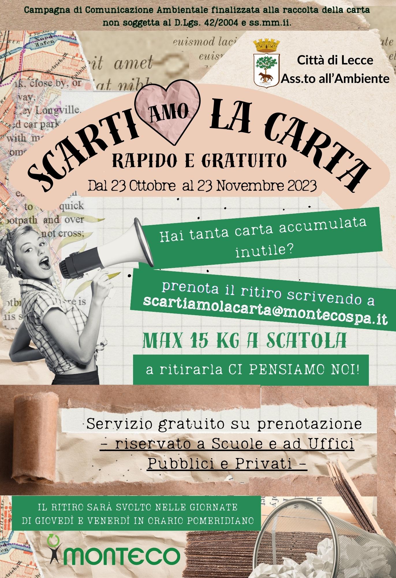 La Campagna di Comunicazione Ambientale "ScartiAmo la Carta" proposta da Monteco SpA ed approvata dall'Amministrazione della Città di Lecce, avrà luogo dal 23 ottobre al 23 novembre 2023 e darà la possibilità a tutte le utenze interessate, Uffici Pubblici e Privati e Istituti Scolastici di prenotare gratuitamente il ritiro del materiale cellulosico di cui vorranno disfarsi scrivendo un' e-mail all'indirizzo scartiamolacarta@montecospa.it .