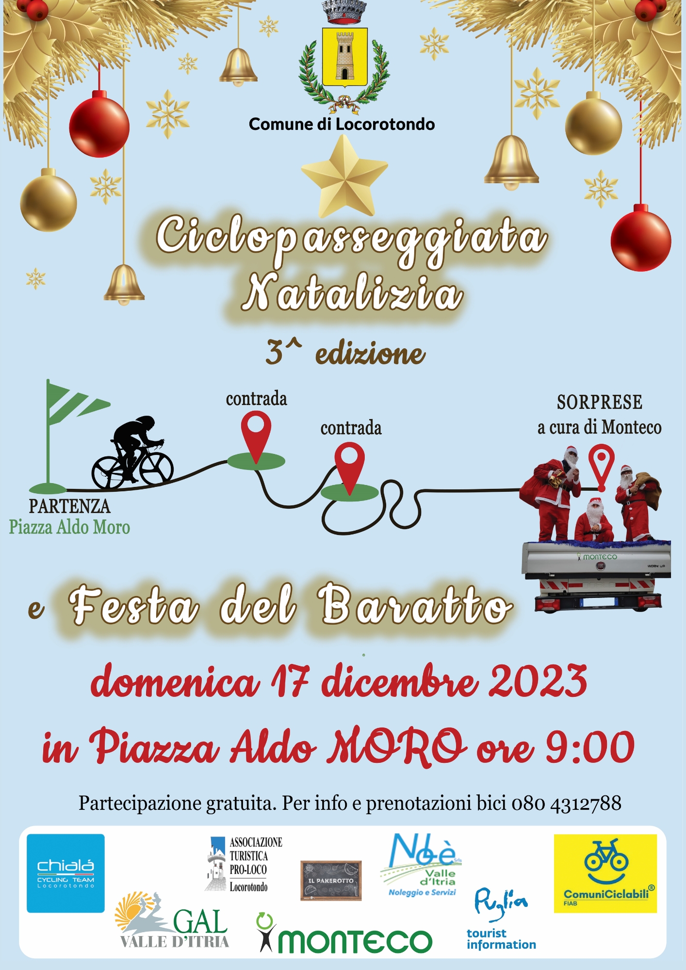 Domenica 17 Dicembre 2023, piazza Aldo Moro dalle ore 9:00 ritorna la Ciclo Passeggiata Natalizia organizzata da Assessorato all'Ambiente in collaborazione con: Chialà - cycling team LOCOROTONDO, ProLoco Locorotondo, Nolè - Noleggio Servizi, Puglia tourist information, ComuniCiclabili, Il Pakerotto e Monteco S.p.A. .