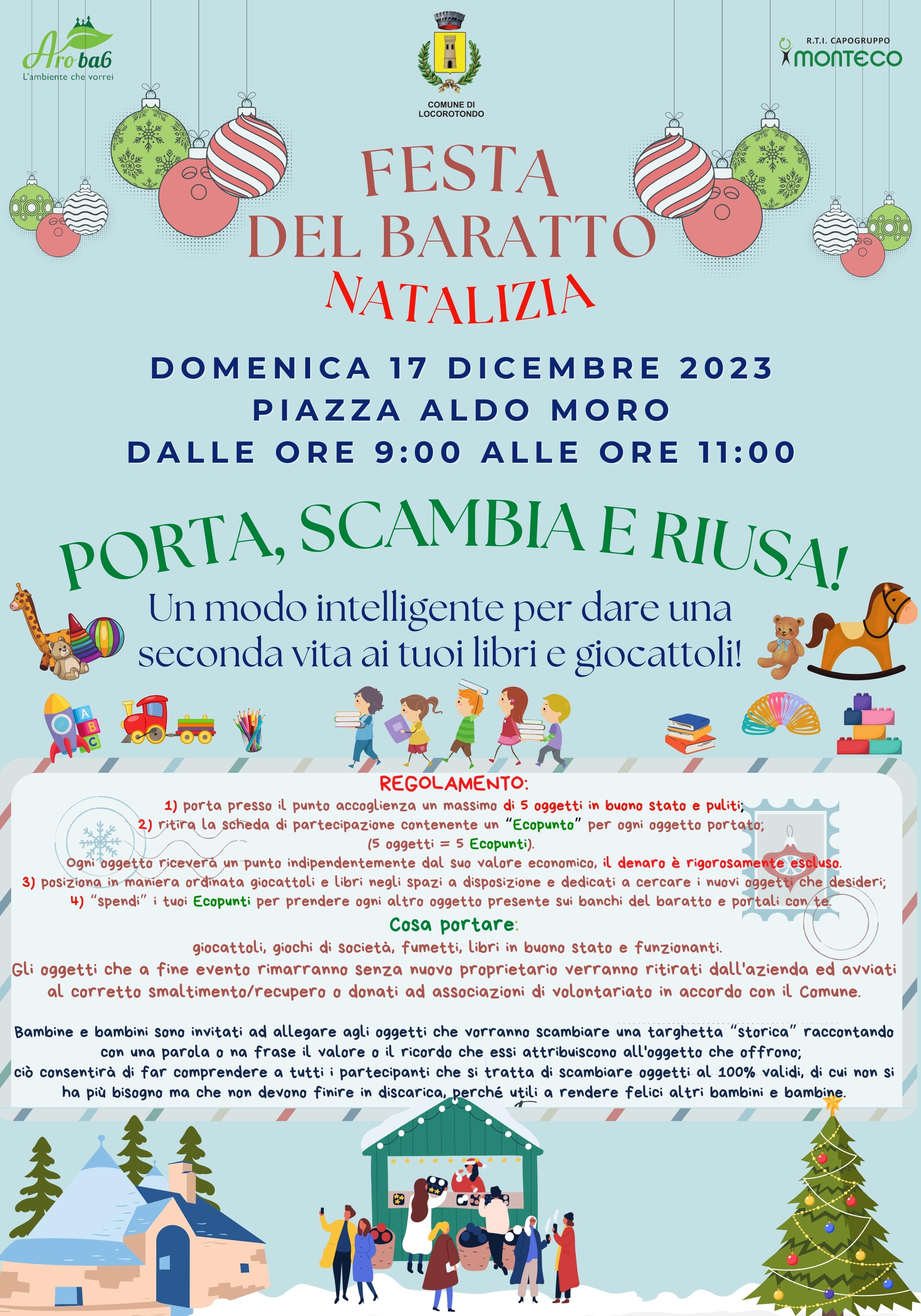Dalle ore 9:00 alle ore 11:00 sempre in piazza Aldo Moro avrà luogo la "Festa del Baratto Natalizia". I bambini potranno portare un massimo di n°5 giocattoli o libri in buono stato da scambiare con altri oggetti in buono stato.