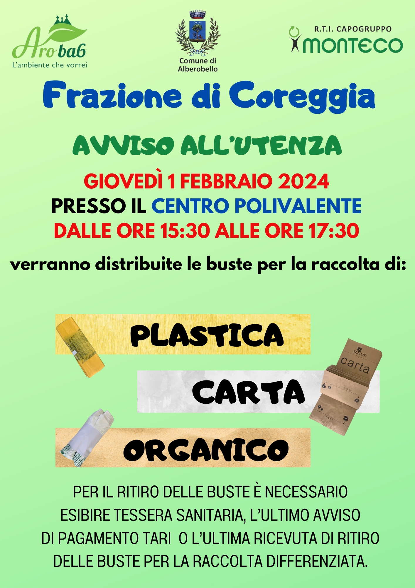 Giovedì 1 FEBBRAIO 2024 l'utenza della Frazione Coreggia potrà ritirare le buste per la raccolta differenziata di: PLASTICA, CARTA ed ORGANICO presso il Centro Polivalente dalle ore 15:30 alle 17:30. Si ricorda, inoltre, che per il ritiro della fornitura di buste è necessario esibire tessera sanitaria, l'ultimo avviso di pagamento TARI o l'ultima ricevuta di ritiro buste.
