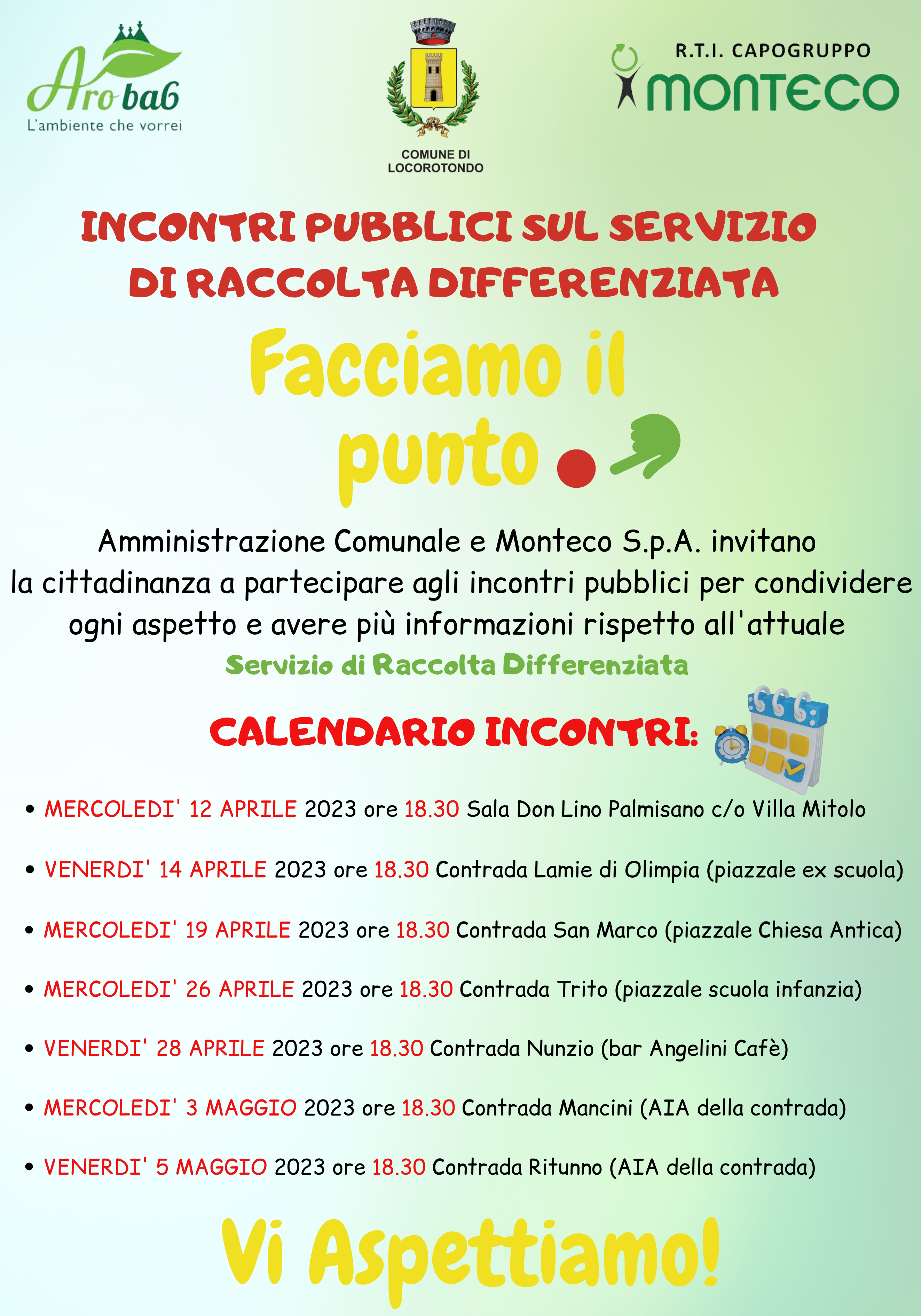 Monteco S.p.A. e Amministrazione Comunale organizzano degli incontri pubblici informativi "Facciamo il punto" per illustrare il Servizio di raccolta differenziata e chiarire ogni eventuale dubbio. Vi aspettiamo Mercoledì 12 aprile 2023 alle ore 18:30 presso sala Don Lino Palmisano c/o Villa Mitolo per il primo dei sette incontri sotto elencati: