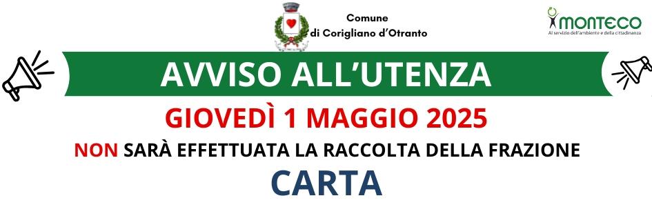 GIOVEDÌ 1 MAGGIO 2025 RACCOLTA CARTA SOSPESA Data 29 Aprile 2025 Corigliano d'Otranto Descrizione Si avvisa l'utenza del Comune di Corigliano d'Otranto che in data Giovedì 1 maggio 2025 la raccolta della frazione CARTA non sarà effettuata. Immagine