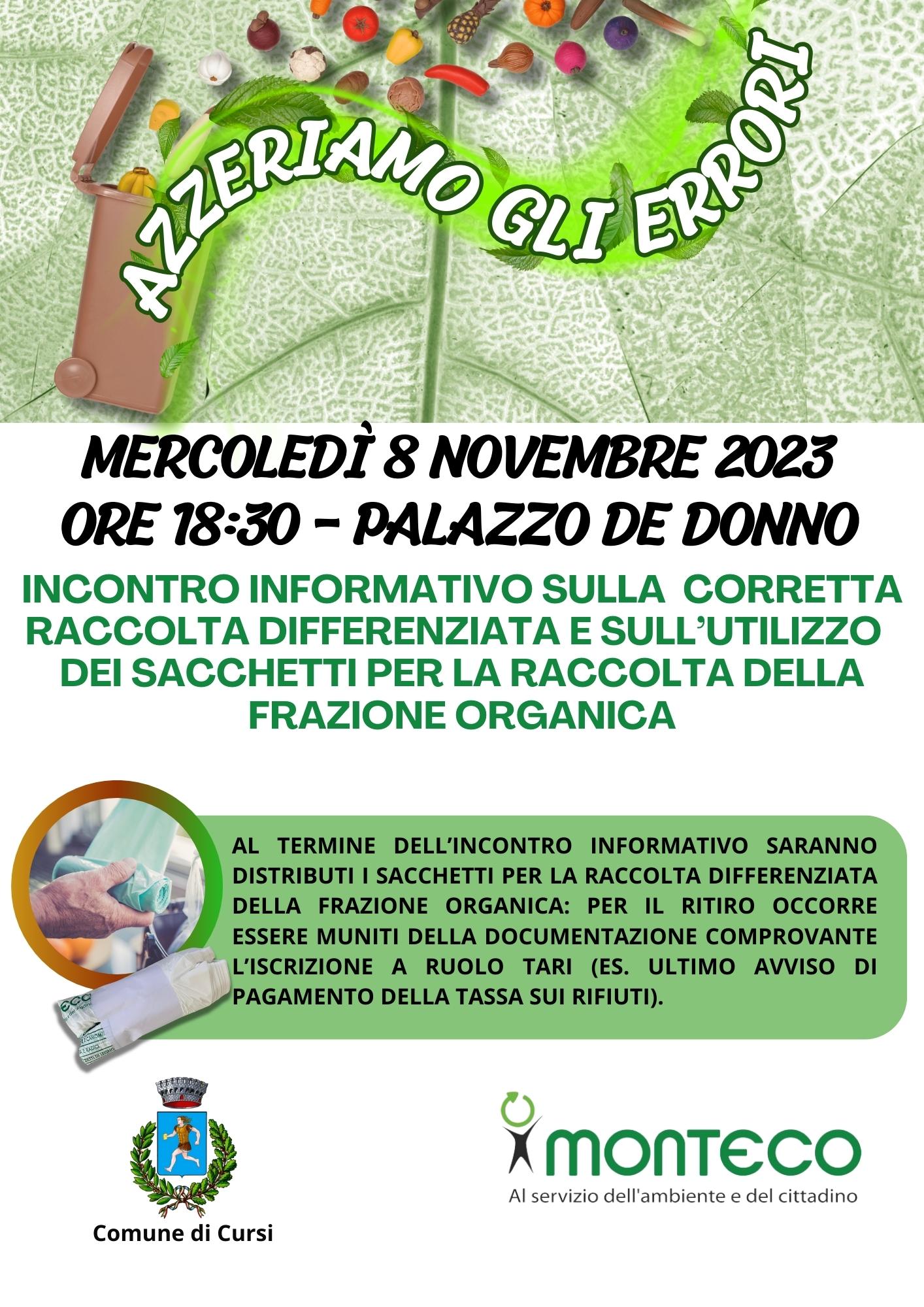 Si informano i cittadini che mercoledì 8 Novembre 2023 alle ore 18:30 presso Palazzo De Donno, il Nuovo Gestore del Servizio di raccolta e trasporto dei rifiuti urbani Monteco S.p.A. terrà un incontro pubblico informativo rivolto a tutta la cittadinanza per sensibilizzare i cittadini alla corretta raccolta differenziata, in particolar modo della frazione organica, e fornire all’utenza informazioni sul corretto utilizzo dei sacchetti.