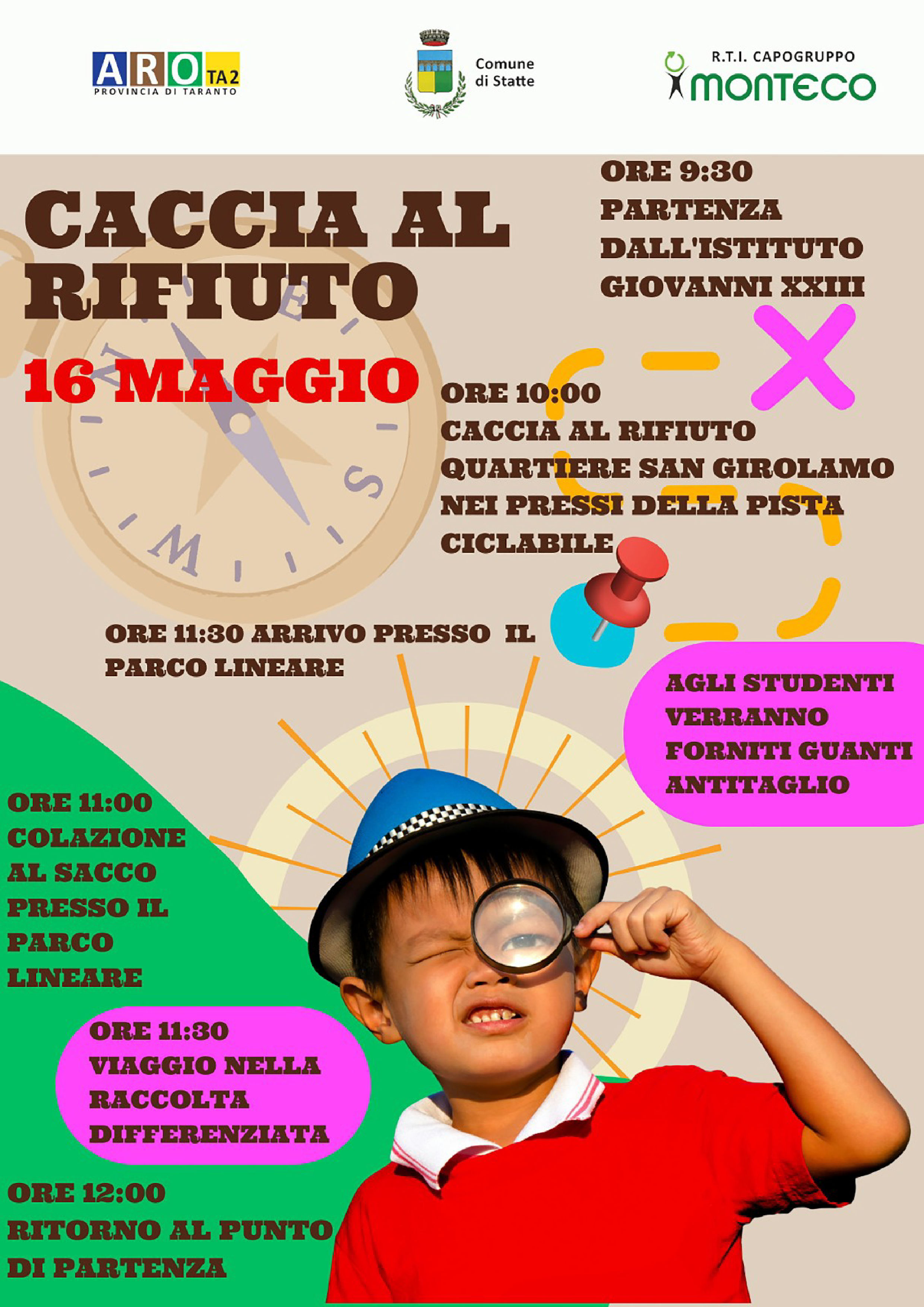 Sabato 16 maggio 2023 gli studenti dell'Istituto Giovanni XIII parteciperanno alla giornata ecologica "Caccia al rifiuto". La partenza è prevista alle ore 9:30 presso l'istituto Giovanni XIII e la "caccia" avrà luogo a partire dalle ore 10:00 nel quartiere San Girolamo, nei pressi della pista ciclabile. Alle ore 11:00 gli studenti si recheranno presso il Parco Lineare dove potranno consumare la loro merenda al sacco e dove alle ore 11:30 la referente dell'ufficio Comunicazione Monteco illustrerà loro le buoni azioni per effettuare una corretta raccolta differenziata. L'orario di ritorno al punto di partenza è previsto per le ore 12:00.