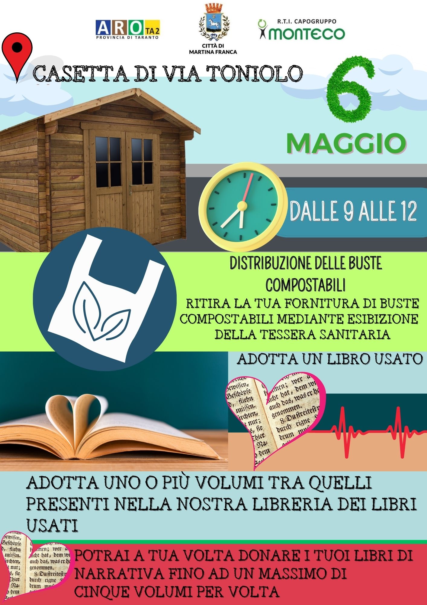 Possiedi dei libri che vorresti donare o sei interessato a cercarne di nuovi? Gli eco-informatori ti aspetteranno ogni primo sabato del mese a partire da sabato 6 maggio 2023 dalle ore 9 alle ore 12, in via Toniolo (ex PEI). L'elenco dei libri presenti è consultabile sul sito martinafranca.montecospa.it . Verranno distribuite anche le buste compostabili per la raccolta della frazione organica per il cui ritiro è necessario la tessera sanitaria dell'intestatario TARI.